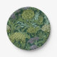 Seamless William Morris style wallpaper pattern featuring dense green foliage and large, rounded flowers in shades of lime green, off-white, and muted lavender against a dark emerald background.