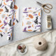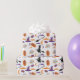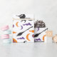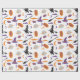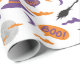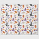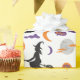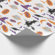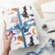 The "Seamless Witch and Broom Wrapping Paper with Moon" features flying witches on brooms under glowing moons and drifting clouds, with playful "boo" accents, making it perfect for spooky Halloween gifts.