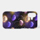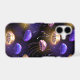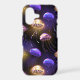 Seamless pattern of bright, golden, purple, artistically drawn, glowing jellyfish on black sea background. Glowing jellyfish.