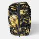 Seamless pattern with black and gold blooming orchids, richly decorated with black eucalyptus twigs and delicate jewellery pistachio twigs on black background. Golden jewellery Orchid.