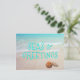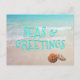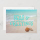 Seas and greetings holiday postcard with beach scene and seashells. All wording, front and back is easy to change to your liking. Bright aqua blue shadow text is printed over tropical ocean water. Send affordable greetings from a warm climate.