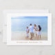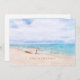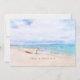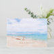 "Seas 'N Greetings" quote in beach sand for the Christmas holiday. Captivating beached fishing boat on a sandy beach with watercolor aqua blue ocean,and sunny sky above. Photo and text templates on reverse side.