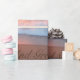 Beautiful pinkish sky sunset and crashing waves upon the beach photograph in Monterey California. "Seas And Greetings" in script in the beach sand.
