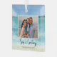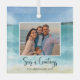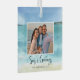 Seas and Greetings Family Photo Beach Ornament - Our custom Christmas ornament features your gorgeous photo on a beach, ocean watercolor background. Seas and Greetings is in a modern, script font with your family name and year. What a lovely way to remember your happy memories. Also makes a great gift. Ornament is part of a collection.