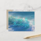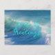 Seas and greetings postcard for the holiday season. Crashing waves background image with large, aqua blue script for your choice of greeting. Add a message and signature to the back over a smooth, beach sand image.