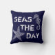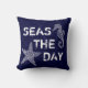 This nautical ocean design, by Cindy Bendel, features a seahorse and starfish. The text reads "Seas The Day", a play on the popular phrase "Seize The Day". The background is blue with a fishnet pattern. This pillow is great for beach theme rooms or beach houses. © Bendel Creative Design LLC All Rights Reserved