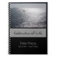 Inspirational picture of seascape with an island and small boat in the distance + "Celebration of Life" with a small drop shadow into a grey rectangle below the picture. Design on spiral notebook for Celebration of Life with name and dates to customise. You can easily change text (colour, font, size and position) by clicking the personalise or customise button. Available in hard cover too. Matching Celebration of Life Invitation.