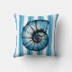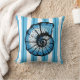 Ocean blue, seafoam blue and white stripes form the background of this nautically inspired pillow. In the foreground, a beautiful illustration of a shell. Perfect decor for you yacht or sailboat, or even for a houseboat.