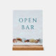 Sea themed "open bar" acrylic sign with seashells border. A water image is the background for custom text. Deep sea blue lettering is shown in uppercase and could also say, "thank you" or "cards and gifts", or "take one". Tropical seashells and starfish and sand dollars are part of the image. Use for reception tables to direct guests. Choose any size.
