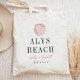 Welcome guests to your destination wedding with these chic beachy personalised tote bags. Design features a coral seashell illustration with your wedding destination beneath (shown with Alys Beach) on two lines of classic serif lettering. Add your names beneath in handwritten cursive script, as well as the year. Text colours can be changed to match your wedding colours using Zazzle's design tool.