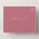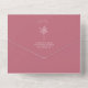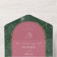 White line art illustration of palm leaves pattern over dark green background with white text and seashell design over pink arch with yellow border. Outside is pink with return address and palm leaf illustration on flap. Rsvp at bottom.