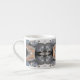 This artwork on this Espresso Cup was made from an original photograph by HomeWare of sea shells. It is a photo of several shells in bright sunlight and shadow. The sea shells are conch and other varieties, mostly white and cream coloured, but one with a light salmon colour on the interior of the shell, and one with black and white stripes. There are many intricate, curving shapes in the design made from the sea shell photo. The overall tone of the pattern is shades of warm grey and white, with a dash of pale salmon pink.