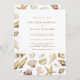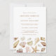 Seashell Wedding Invitation. Unique & stylish, this modern beach wedding invitation features beautiful hand-painted seashells, coral, and starfish in earth tone neutrals. The text is tan, and the background is white. The back includes a whimsical seashell pattern. Find matching items in the Watercolor Seashell Beach Wedding Collection.