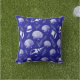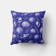 Pillow in a pattern of seashells and delicate seaweed patterns arranged on a dark navy blue background, creating a striking contrast. The detailed line work adds an intricate and naturalistic feel to the composition.