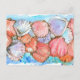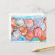 A postcard featuring a beach theme with layers of clam shells hand drawn with sepia ink and painted with bright shades of salmon pink and lavender watercolor accented with spatter spots and turquoise blue as if among the waves.