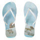 Pretty beach scene flip flops, with graphics of a sandy beach and seashells. Customise to add text to this tropical pair of summer slippers.