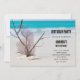 Birthday party invitation wwith a gorgeous photograph. Tropical blue water and foamy surf in the background. A collection of seashells and stems set on a white sandy beach.
