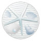 Soft bluish grey starfish, seashells, and an open oyster with a pearl....all over a background of the shadows of overlying ocean waves.