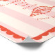 Line art red seashell illustrations and hand drawn scalloped border with red text over pink striped background.