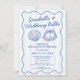 Celebrate the bride-to-be with this chic and playful Coastal Blue Beach Bachelorette Invitation. Featuring a trendy "Seashells & Wedding Bells" theme, this double-sided card serves as both an invitation and a detailed weekend itinerary. The design features whimsical hand-drawn doodle illustrations—including seashells, wedding bells, and a wavy squiggle frame—set against a timeless light blue and white cabana striped background. Perfect for a destination weekend in Florida, the Hamptons, or a tropical resort, the template wording is fully customizable using the Zazzle design tool. Easily update the name, dates, location, and schedule of events to fit your specific "Beach Bach" plans. Perfectly suited for beach bachelorette weekends, nautical bridal showers, or destination wedding events, this design effortlessly captures the highly sought-after 'Coastal Grandmother' aesthetic and the timeless 'Preppy Old Money Beach Club' style to ensure your "I do" crew are blown away when they receive these beautiful custom invites.