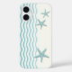 A fun abstract beach scene phone case with wavy teal lines that represent surf with a scattering of starfish along surf's edge. Designed for iPhones.