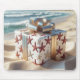 A beautifully wrapped gift adorned with starfish patterns sits in the golden sands of a beach, with gentle ocean waves lapping in the background