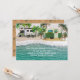 Camping Christmas greeting cards with beach design. Two campers, a trailer and Class B drivable RV, are parked among palm trees and next to the ocean. Add your personal holiday message, in white script, over a background of turquoise sea water. Typical of campsites near the water, campers share the views in close proximity. These flat cards have a pattern of sand snowmen and palm trees on the back. This design can also be purchased as an instant download and shared digitally.