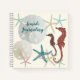 Beach themed, spiral bound notebook with your choice of paper inside. Personalise with any text on the front where the design includes big sand dollars, sea horses and starfish. Ecru colour with dark sea green script. The same design is printed on the back of the notebook. Use for personal journalling, taking notes, or leave in a rental house for guests to use for reviews.