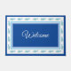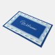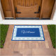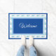 Shown in the large size, this doormat is part of the "Seaside" collection and has fun seahorses in Blue/Green all around the border edges of the door mat. In Royal Blue, this mat has coordinating stripes of Sky Blue, Cornflower Blue and White. Welcome written in fancy script in the centre. Customise this design or buy as shown.
