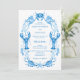 Set the tone for your seaside celebration with this Seaside Elegance watercolor wedding invitation. Hand-painted in delicate shades of cornflower blue, this elegant design features a mirrored border of ocean treasures, lobsters, crabs, seashells, starfish, coral, and seaweed, against a crisp white background. The reverse side displays a coordinating ogee-style crab and lobster pattern for a beautifully finished look. Perfect for brides planning a coastal, nautical, or beach wedding, this invitation blends seaside charm with timeless sophistication. All text is fully customizable, allowing you to tailor the wording to suit your unique day. Designed by and copyright of Kaitlyn Thomas of The White Rosebud.