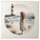 A graceful young woman in a flowing white dress wanders along the sandy shore, her sun hat tilted against the breeze as she gazes towards a striped lighthouse standing strong against the waves. Gentle grasses frame the foreground while seabirds and a sailboat drift across the horizon, adding a sense of calm movement to the coastal landscape. The soft watercolor style blends romance and serenity, creating a timeless cottagecore-inspired seaside scene that feels both nostalgic and dreamlike. AI generated artwork.