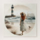A graceful young woman in a flowing white dress wanders along the sandy shore, her sun hat tilted against the breeze as she gazes towards a striped lighthouse standing strong against the waves. Gentle grasses frame the foreground while seabirds and a sailboat drift across the horizon, adding a sense of calm movement to the coastal landscape. The soft watercolor style blends romance and serenity, creating a timeless cottagecore-inspired seaside scene that feels both nostalgic and dreamlike. AI generated artwork.