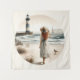 A graceful young woman in a flowing white dress wanders along the sandy shore, her sun hat tilted against the breeze as she gazes towards a striped lighthouse standing strong against the waves. Gentle grasses frame the foreground while seabirds and a sailboat drift across the horizon, adding a sense of calm movement to the coastal landscape. The soft watercolor style blends romance and serenity, creating a timeless cottagecore-inspired seaside scene that feels both nostalgic and dreamlike. AI generated artwork.