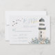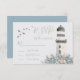 Watercolor Seaside Lighthouse with seashells, coral and soft green and blue foliage on a faux, very light background. The back is a dusty blue background.