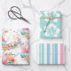 Tropical theme wrapping paper sheets feature a watercolor beach sunset with cocktails, flowers and palm leaves with a "Sip Sip Hooray" caption on sheet one. The second sheet features a pattern of white hibiscus flowers with an aqua blue background, and the third sheet features a stripe pattern in coral, blue, turquoise and pink. Perfect for birthday, showers, holiday, parties and celebrations with beach, luau and tiki themes.