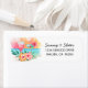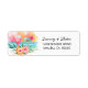 Tropical theme return address labels feature a watercolor beach sunset, cocktails, hibiscus flowers and palm leaves.
