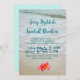 Edge of the sea typography wedding invitation with fun lines of text. Names of the couple at the top are in large script over a big "and sign". Text is dark blue over a background image of smooth beach sand and water coming ashore. Two bright pink frangipani blossoms decorate the bottom of the paper. This invitation is perfect for a casual seaside ceremony and also comes as an instant download.