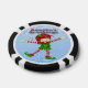 Season's Greetings Elf Poker Chips features a light blue background with swirls and snowflakes, a Happy Santa's Elf wearing red and green, holding a colourful candy cane. Stylised red striped text is Season's Greetings. Perfect for Christmas card games or as a Christmas gift. Casino quality ceramic poker chips. Textured surface for easy stacking. Printed with full colour graphics on the front, back, and side of chip. Choose from solid or striped edges in 12 vibrant colours. Matches our Season's Greetings Elf Playing Cards.