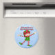 Season's Greetings Elf Round Magnet features a light blue background with swirls and snowflakes, a Happy Santa's Elf wearing red and green, holding a colourful candy cane. Stylised red striped text is Season's Greetings. Perfect gift for Christmas stocking stuffer!