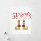 Festive hand lettered "Season's Greetings " text with a pair of Christmasy elf shoes.