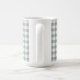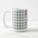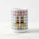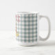 Fun Holiday Season coffee mug features festive hand lettered "Season's Greetings " text with a pair of Christmasy elf shoes and room to add personalisation on a grey and white plaid background.