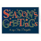 A stylish Christmas card for a Step Daughter, with 'Season's Greetings' in red and white and dark green and white polka dot lettering, outlined in gold-effect on a deep blue background and scattered with gold-effect and red stars. You can easily change the inside message on this text-based digital design by Judy Adamson and if you can't find a card for the person you want to send it to, there is a custom-front version you can personalise.