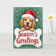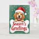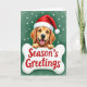 This absolutely charming Christmas card features a beautifully rendered, happy Golden Retriever puppy wearing a classic Santa hat. The cheerful dog is grinning widely, resting its paws on a large white dog bone that displays the holiday message. The text "Season's Greetings" is written on the bone in bold, festive red script. The background is a lovely, deep green with large, stylised snowflakes falling. This heartwarming card is an ideal choice for sending warm, joyful wishes from the whole family, especially from the dog!🎄🎁! Perfect for spreading holiday cheer to loved ones near and far.