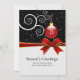 Season's Greetings Ornament Monogram Name Template Flat Card is a template for you to personalise with your own holiday greeting with your family names or business employees. Red ornament on a whimsical white branch and falling snow in the background with an image of a red ribbon. These greeting flat cards are also perfect for corporate and small business holiday cards.