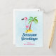 A holiday postcard which says Seasons Greetings. Designed with a whimsical drawing of a pink flamingo wearing a red santa hat. Standing on a mound of yellow sand with a green and brown coconut palm tree in the back. Light blue background. Cute and fun festive tropical design. Message on the back you can personalised.