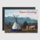 An image of a Native American and his horse near a tipi in the Pacific Northwest. Snow has settled on the higher slopes of the mountains in the background. Text reading, "Season's Greetings" appears in red.
