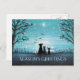 Season's Greetings Winter Sunset. Two dogs and cat silhouette watching the sunset on a winter evening. In colours of blue, black and white. With two trees on both sides and birds flying towards the sunset. Snowflakes falling and a couple of bright stars in the sky. Winter scenery Original Acrylic Painting Art done by Donna Leger for Irony Designs. All Rights Reserved