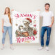A festive and cheerful Christmas holiday design showcases a skeleton wearing a Santa hat, reading a book, and holding a steaming cup of coffee. Surrounding him are poinsettias, holly berries, and pine tree branches. The colourful text says: "Season's Readings." This design is available on a variety of products, making it the perfect gift for book lovers.