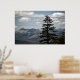 A photograph of a large pine tree with a view of mountains.