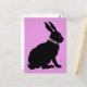 This postcard has a seated Easter or Spring time rabbit in black silhouette with a wreath of colourful pretty flowers around its neck and a pink eye on a pink background.
